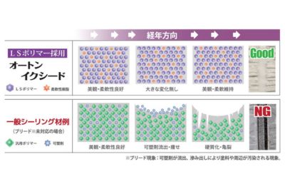 耐久性・耐候性の限界に挑む。新規開発「LSポリマー」の実力 新開発「LSポリマー」の誕生により、経年で流出する可塑剤を配合せずに優れた柔軟性を実現。経年による硬質化を防ぎ「柔らかさを長時間維持」