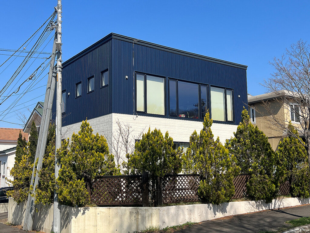 外観のデザインはマットブルーとホワイトを組み合わせることで、お庭の緑とのコントラストができるようにいたしました。
